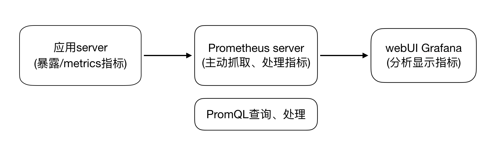 在监控流程中,主要由三个部分组成:被监控的应用暴露性能指标(exporter),promethues 应用采集性能指标(collector),数据可视化分析界面(web UI)。详情参照下述: