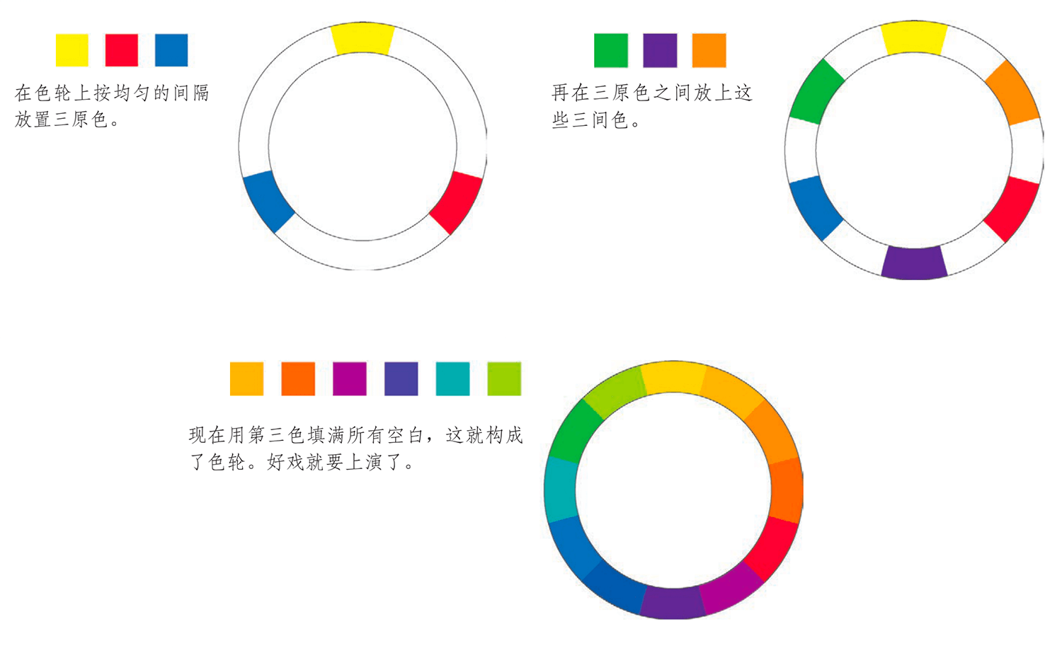 - 其余位置将相邻的两个颜色等量混合,就会得到 第三色 。