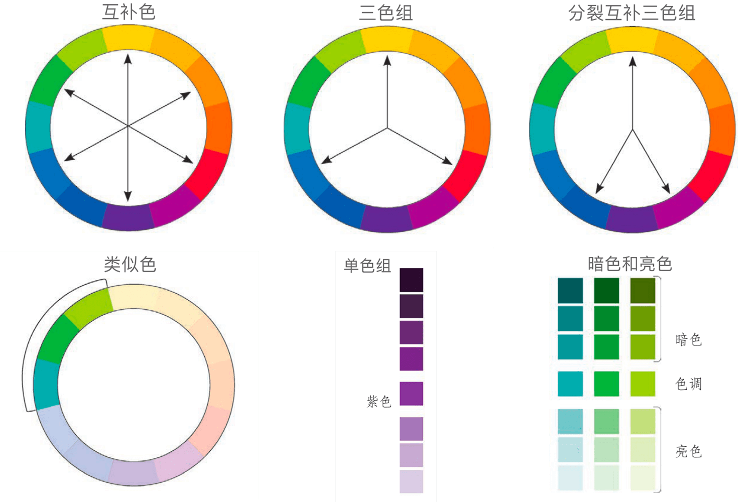 - 互补色:色轮上相对的颜色为互补色 。利用它们的对立关系,常见搭配是一种作为主色,而另一种用于强调。